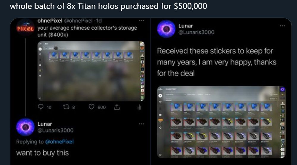 @kava Да, все относительно... Справедливости ради, в кс тоже иногда продают скины по $ 150k, а обычная наклейка на оружие, которая стоила когда-то несколько долларов, сейчас уходит за $ 50k+